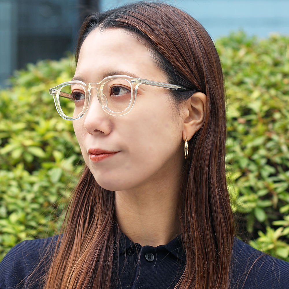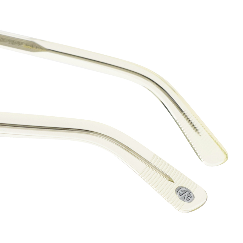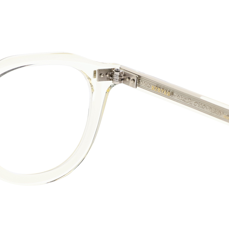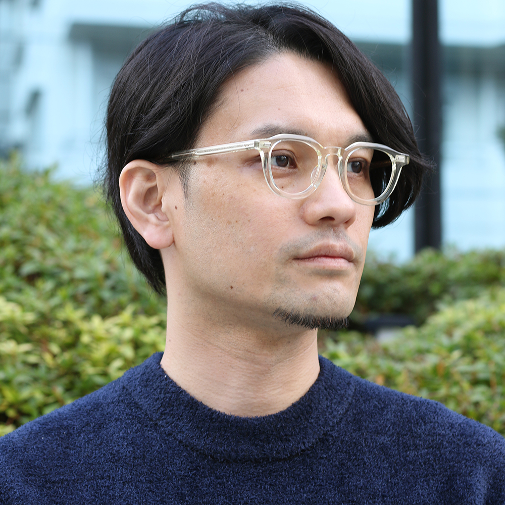 ウェリントンとクラウンパントの中間的なレンズシェイプとホーンリムを融合させたフレーム。