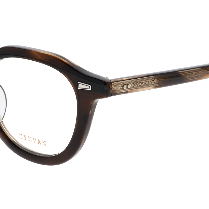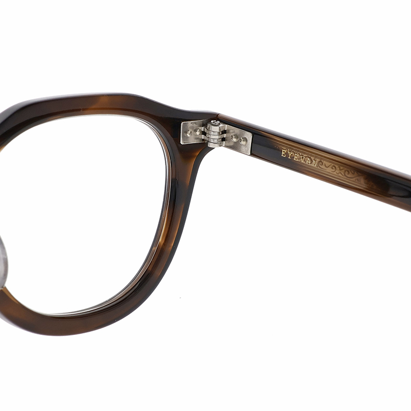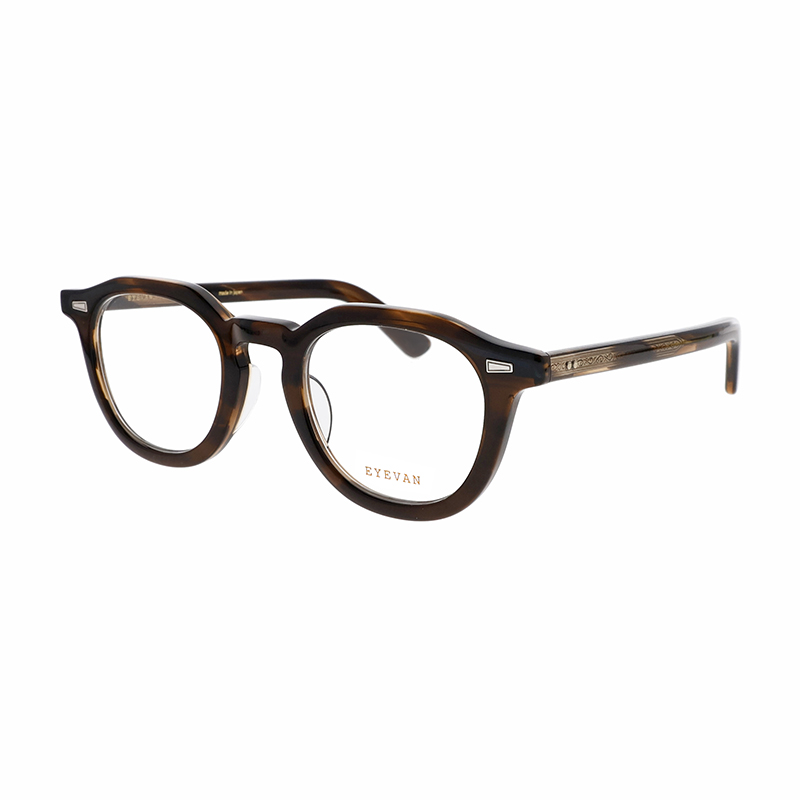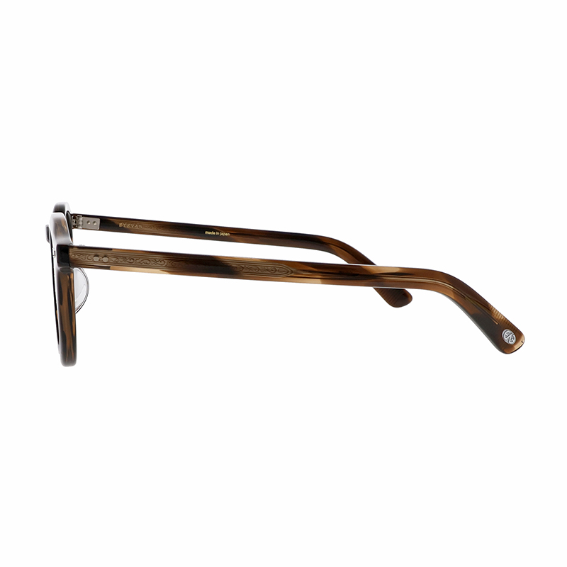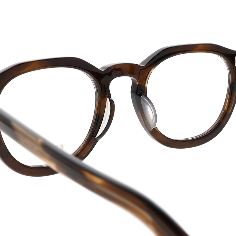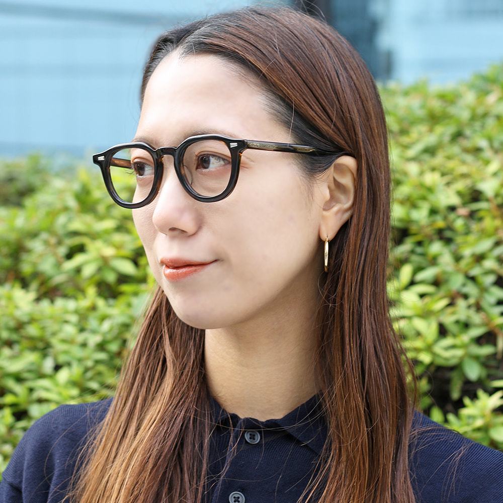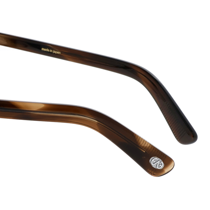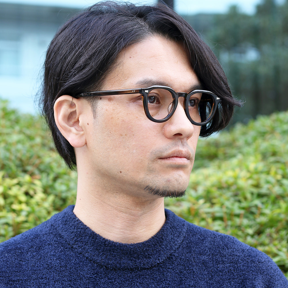 ウェリントンとクラウンパントの中間的なレンズシェイプとホーンリムを融合させたフレーム。