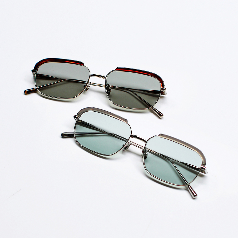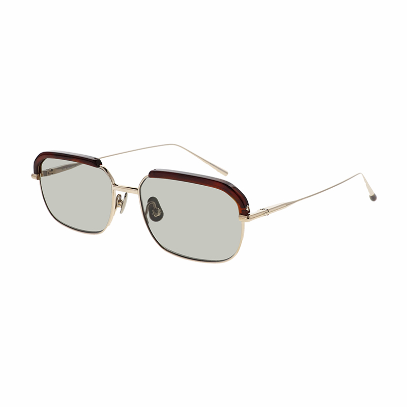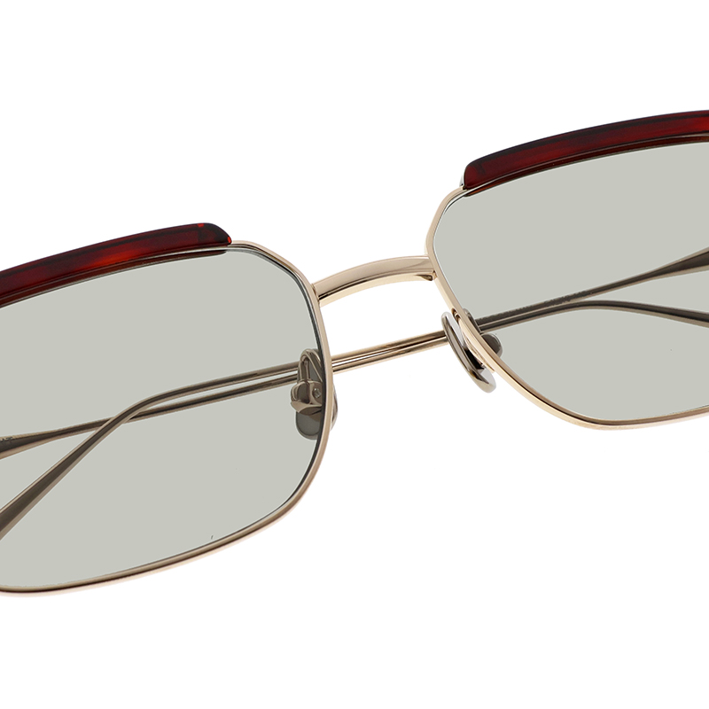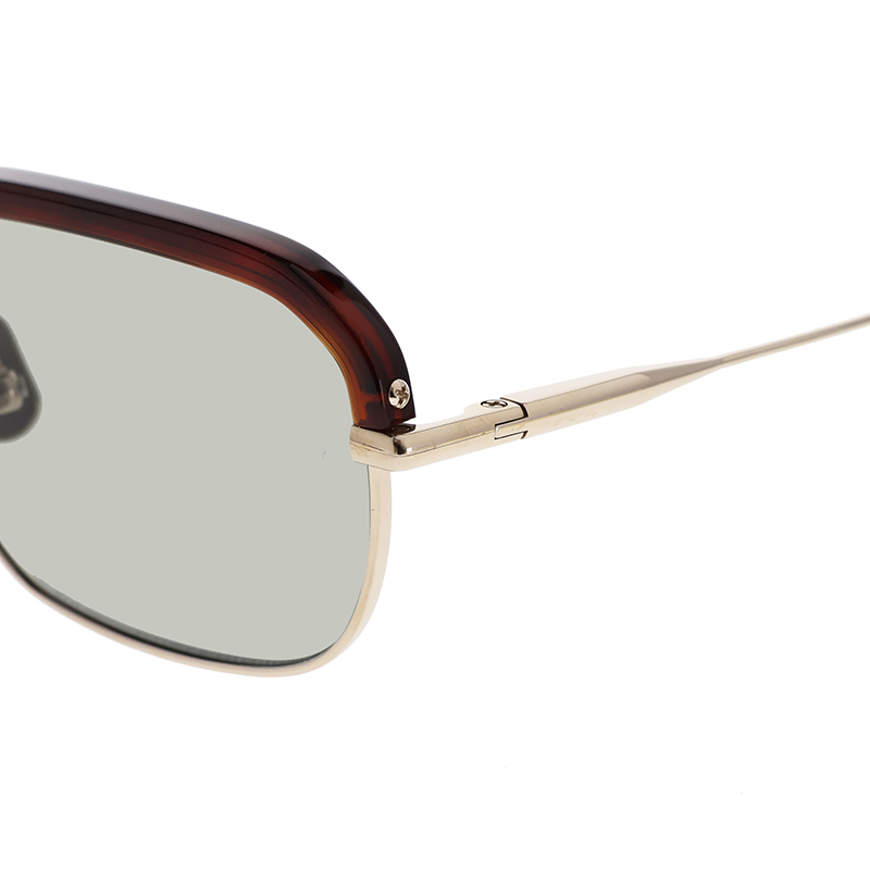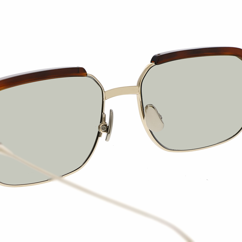アセテートのブローパーツが付いたメタルのスクエアシェイプモデル。