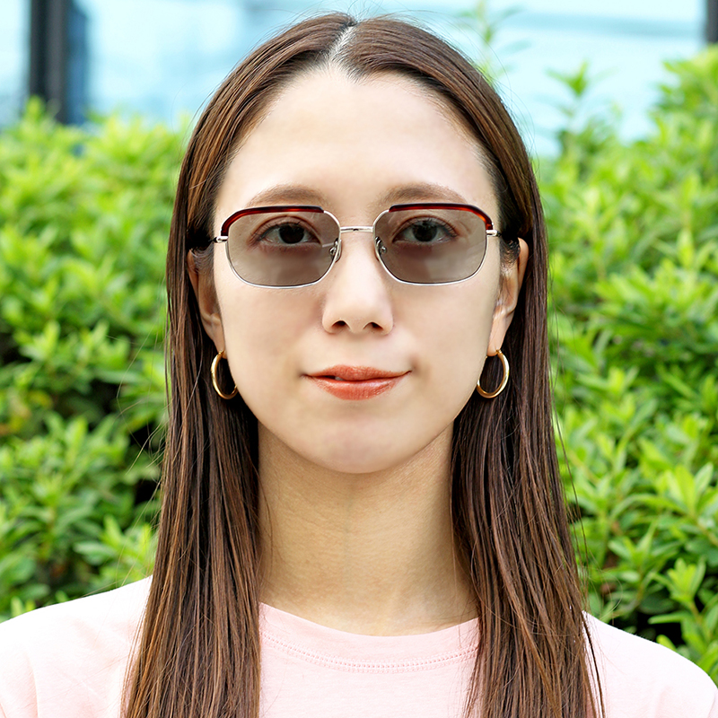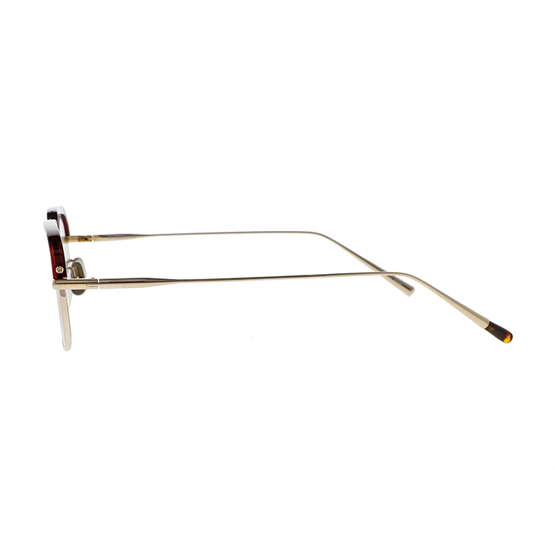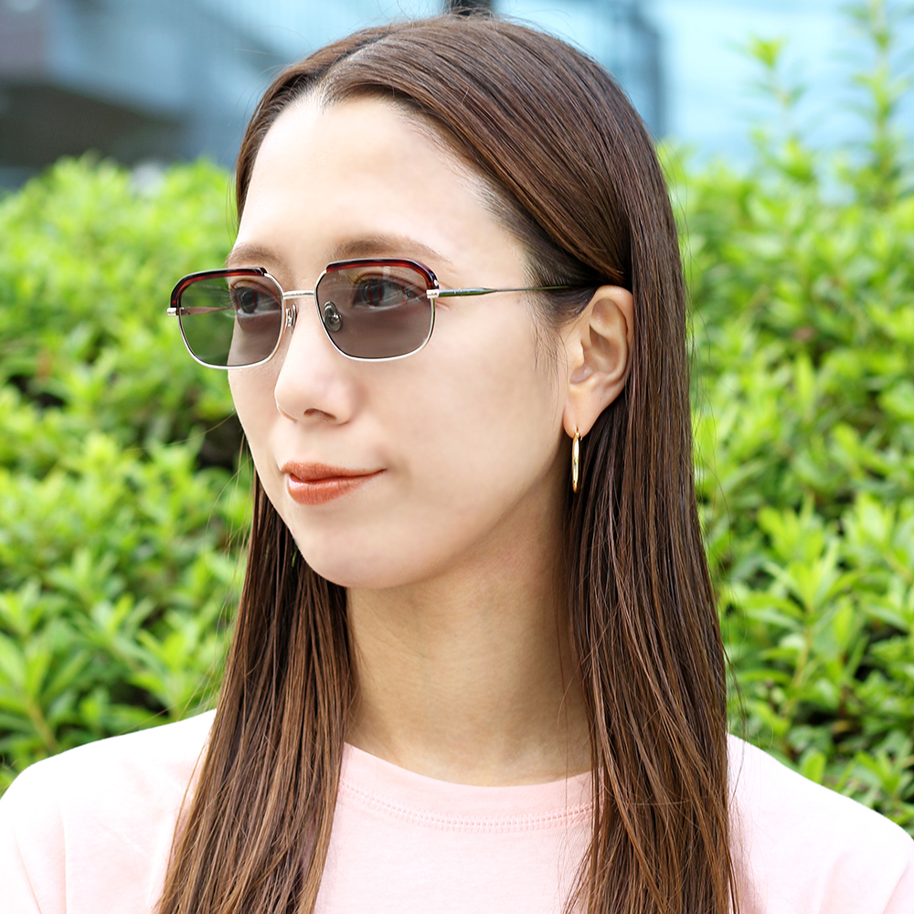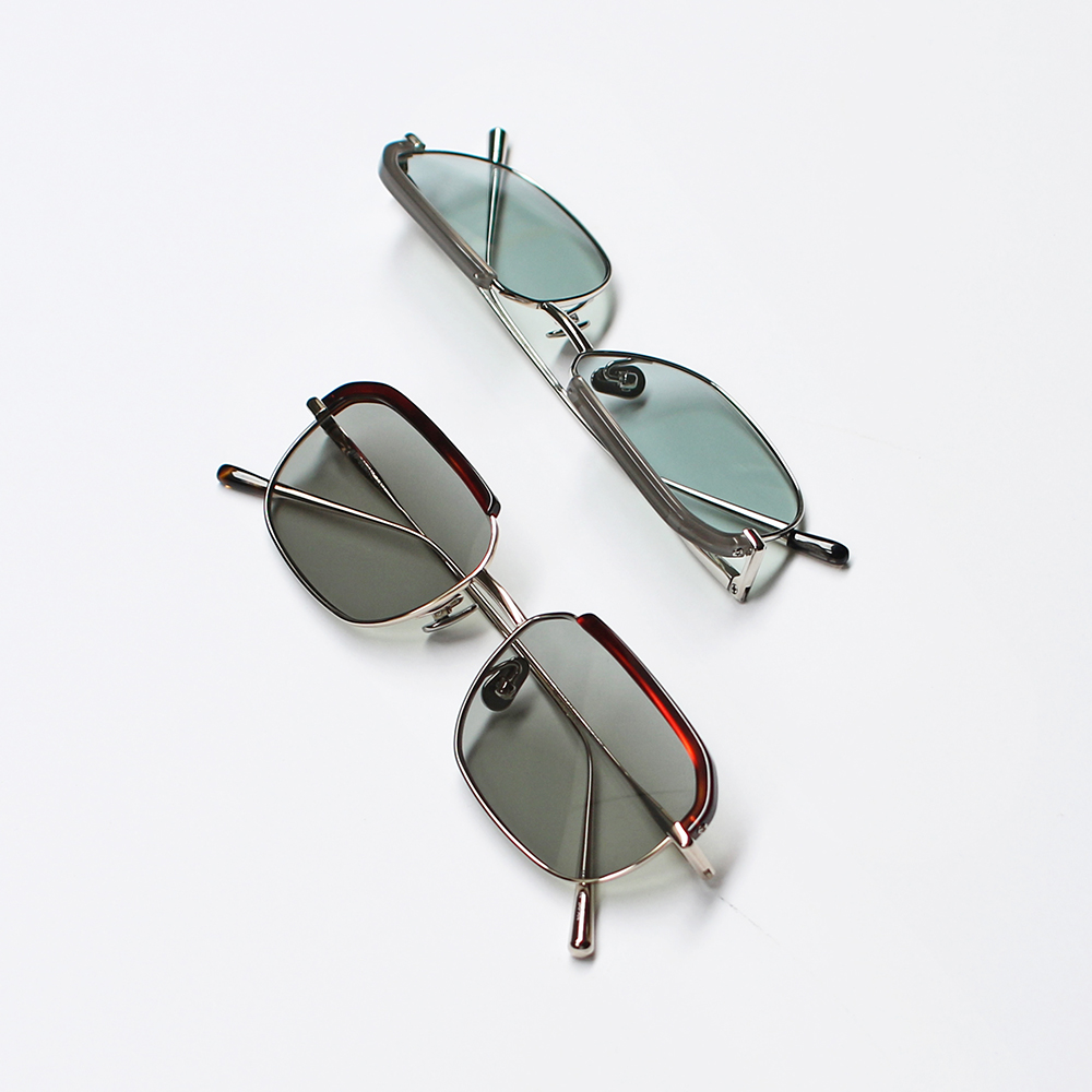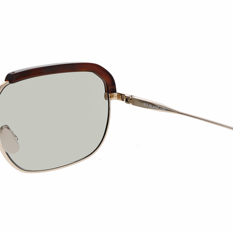 アセテートのブローパーツが付いたメタルのスクエアシェイプモデル。