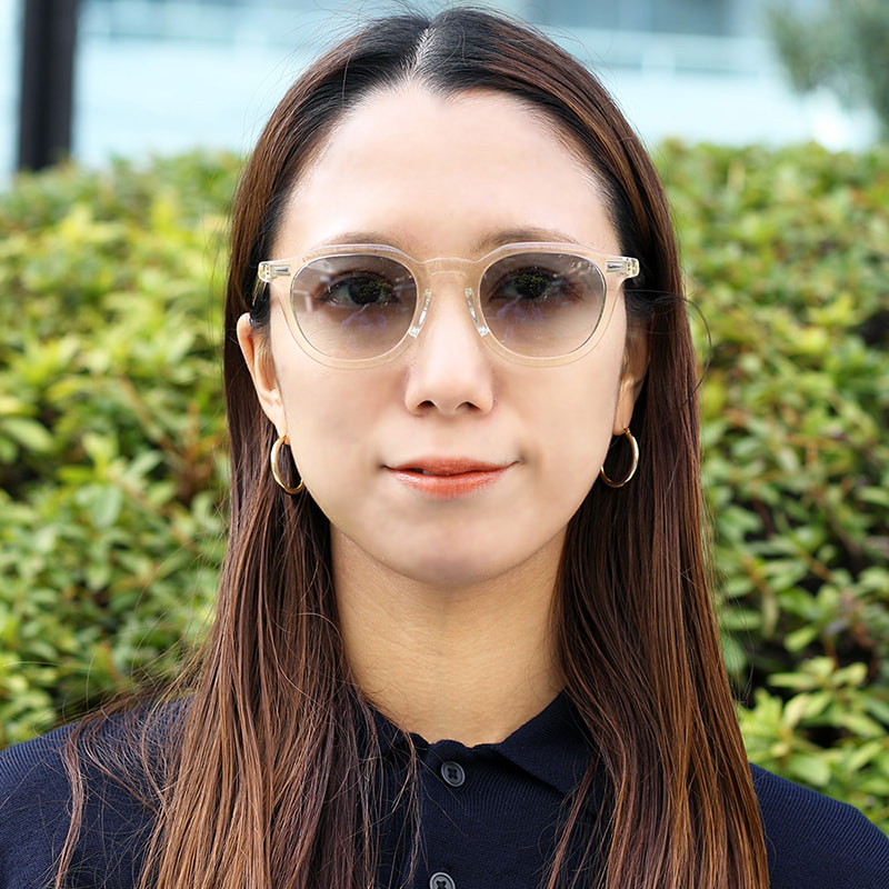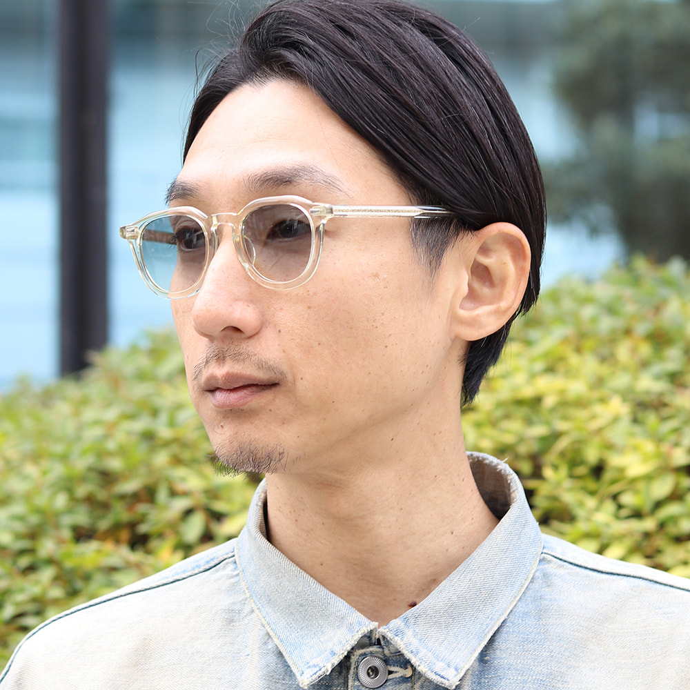 ウェリントンとクラウンパントの中間的なレンズシェイプとホーンリムを融合させたサングラス。
