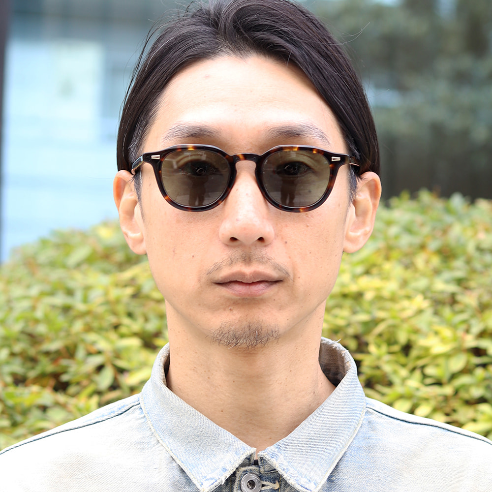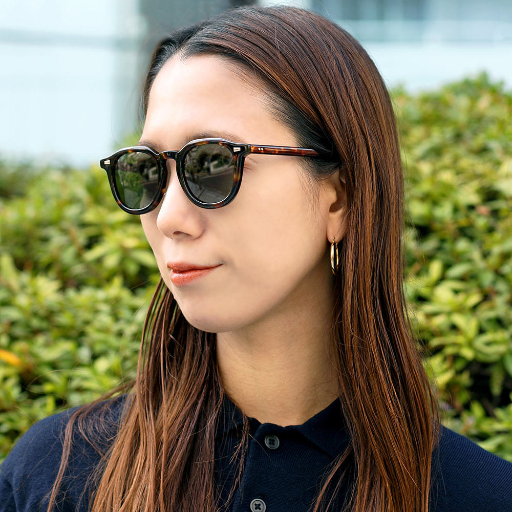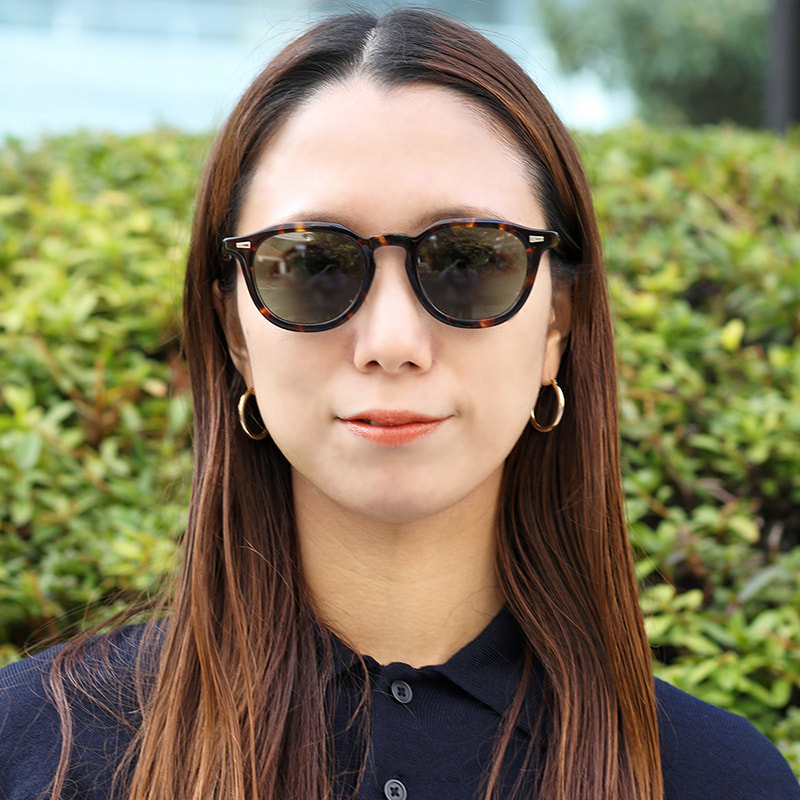 ウェリントンとクラウンパントの中間的なレンズシェイプとホーンリムを融合させたサングラス。