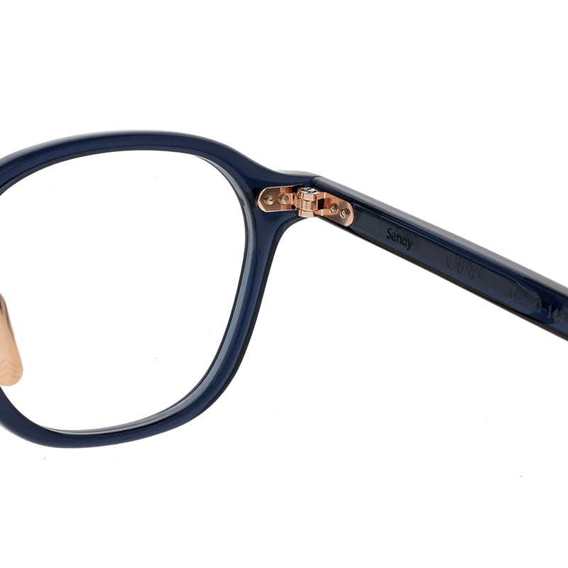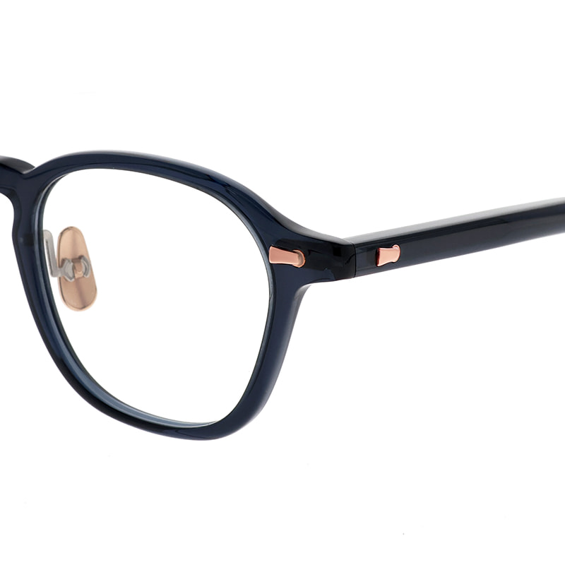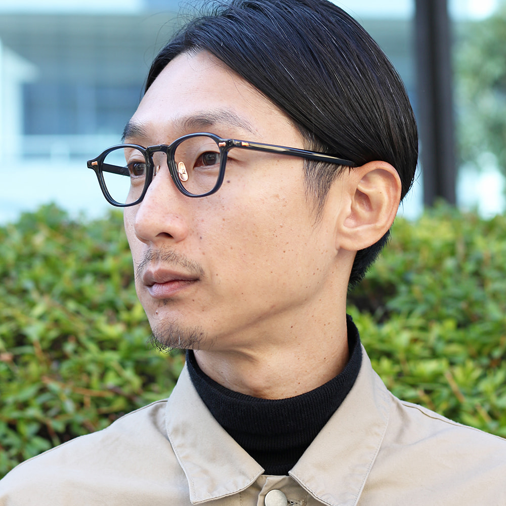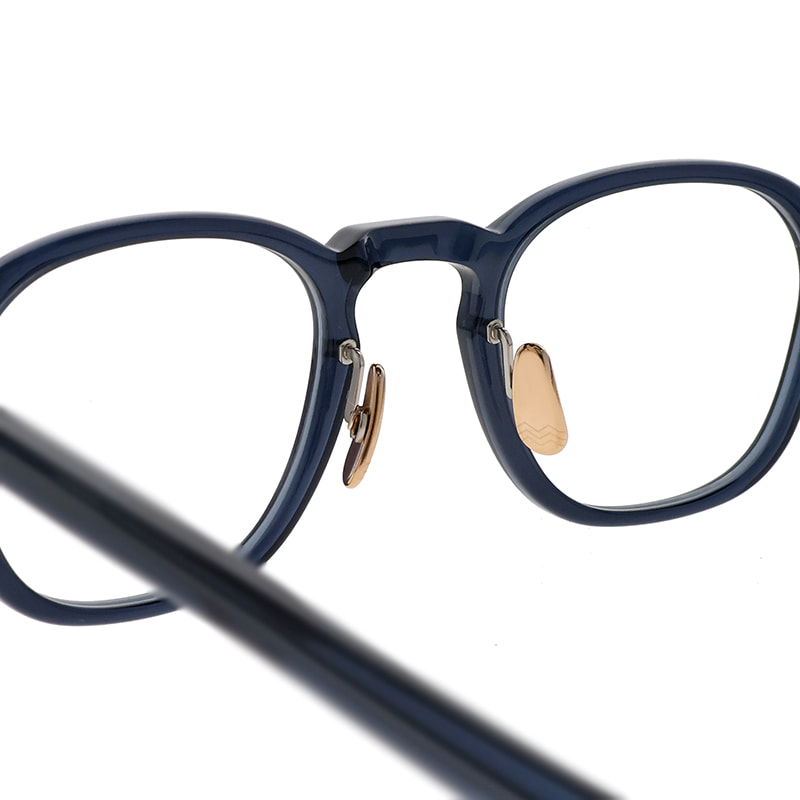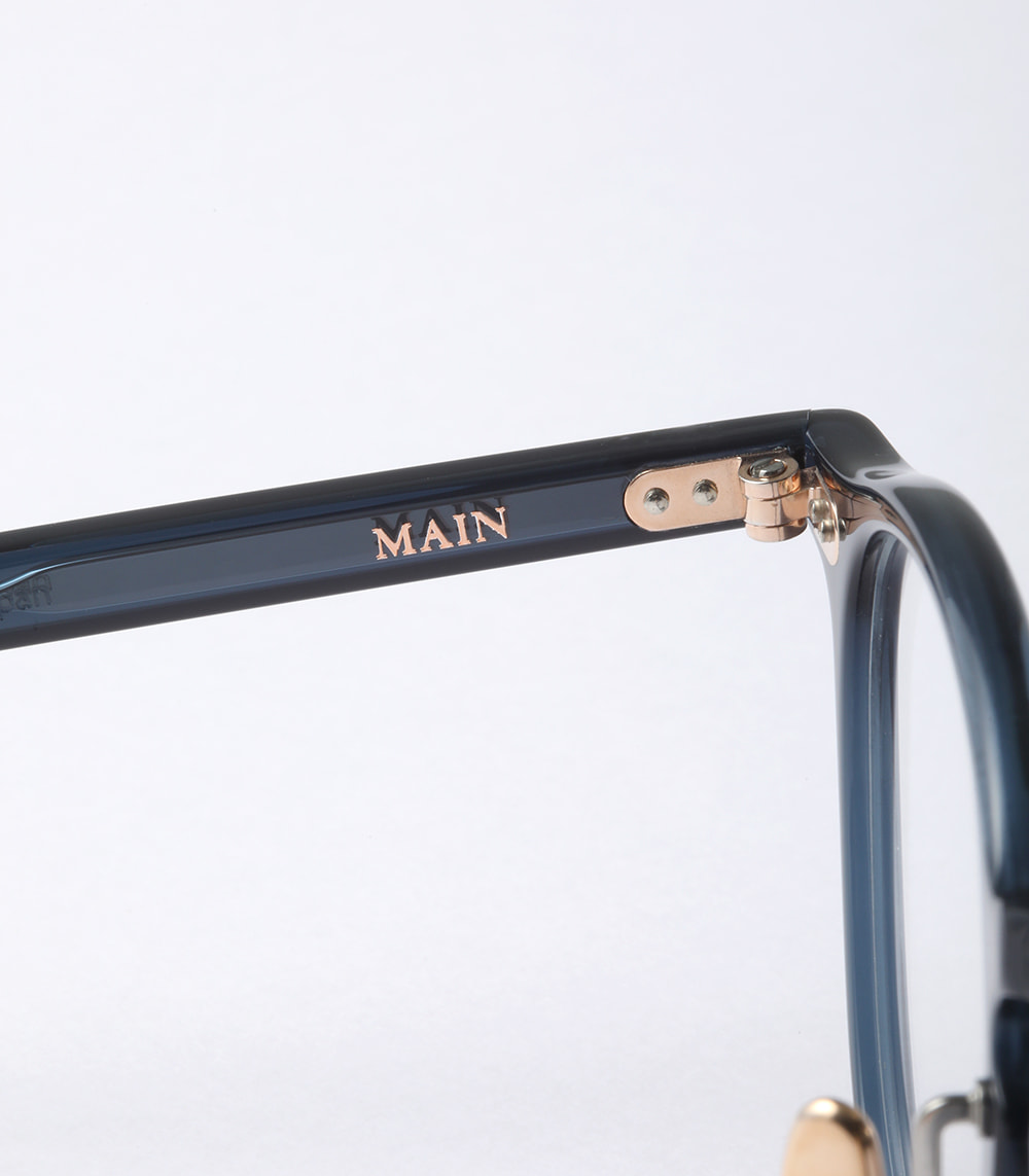 カシメ飾りに使用する金属パーツに合わせて、丁番、チタンノーズパッド、ブランドロゴまでを同じカラーに仕上げています。アセテート生地と金属のカラーリングによる多彩な組み合わせはMAINの魅力のひとつ。