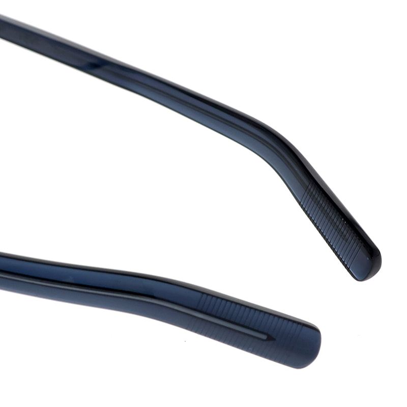 フロント側からテンプル先に向かって断面が甲丸から角が立った造形に変化していくようにデザインされた特徴的なテンプルは、「放電」と呼ばれる金型を使った製造方法を用いて作られています。この製法は派手なデザインを作る際に用いられますが、金型を使いながらもあえてプリミティブな形状にすることでブランドの哲学でもある普遍的なディティールを表現。