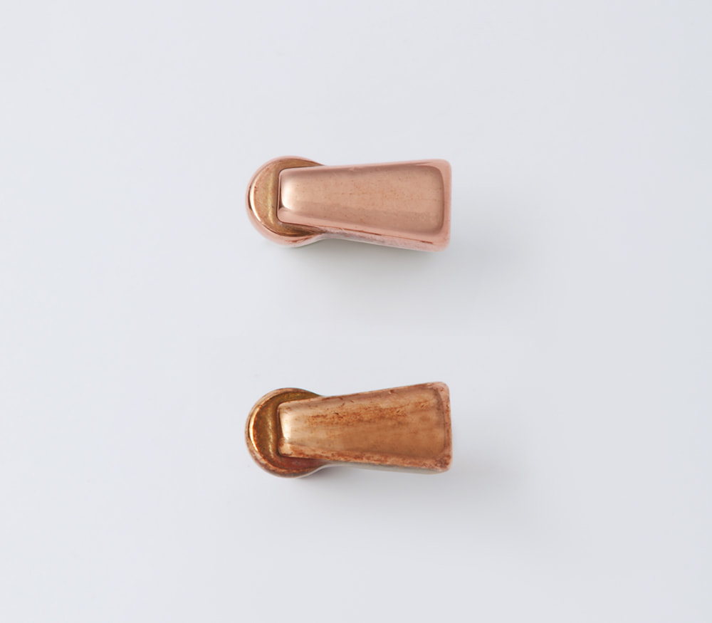 ビンテージデニムやツールバックの補強パーツとして用いられ、抗菌効果があるとされている銅は、美しいローズゴールドの色合いから、カッパー色に経年変化します。シルバー925や真鍮に比べて変化が最も早く、風合いと色合いの変化を最も楽しむことができます。