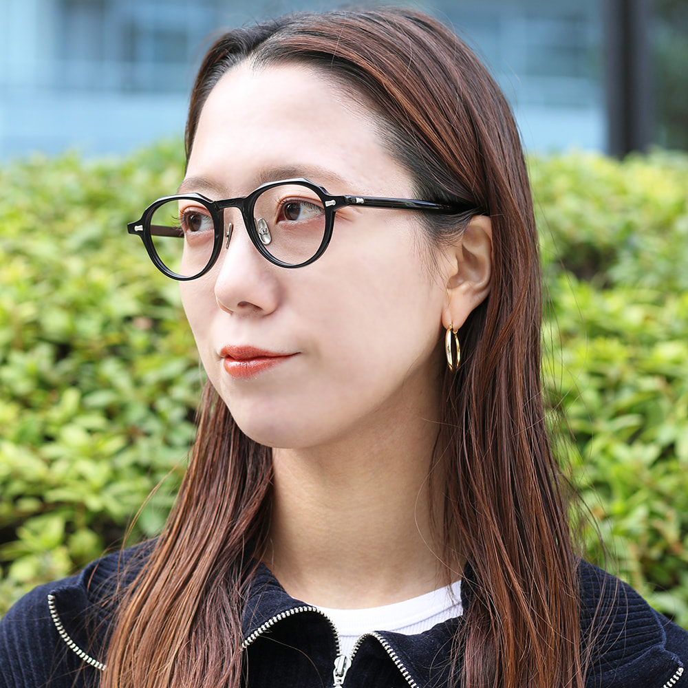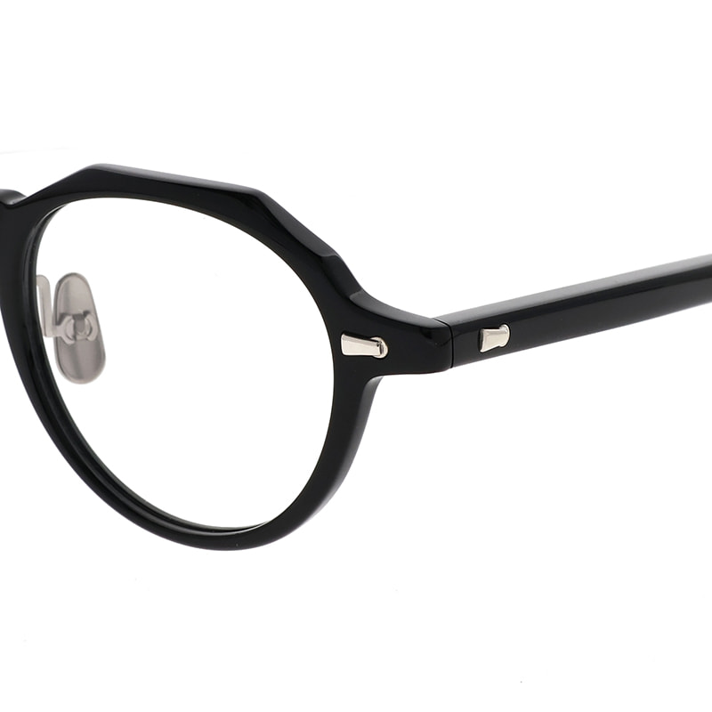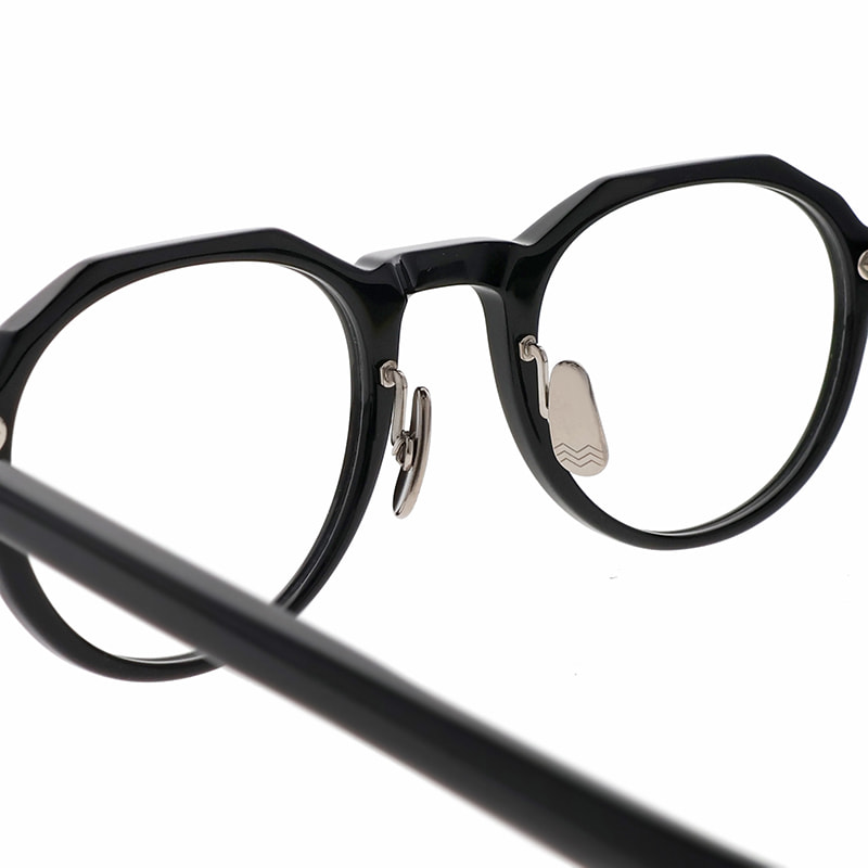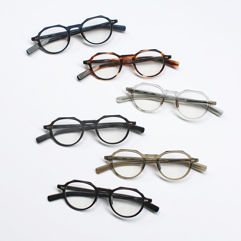 カシメ飾りに使用する金属パーツに合わせて、丁番、チタンノーズパッド、ブランドロゴまでを同じカラーに仕上げています。アセテート生地と金属のカラーリングによる多彩な組み合わせはMAINの魅力のひとつ。