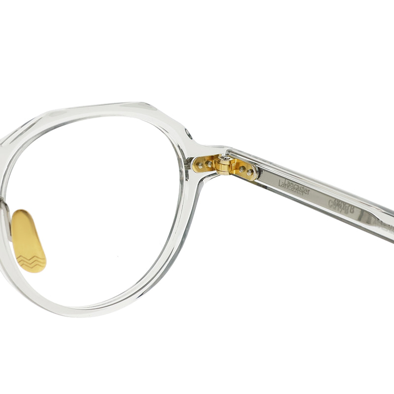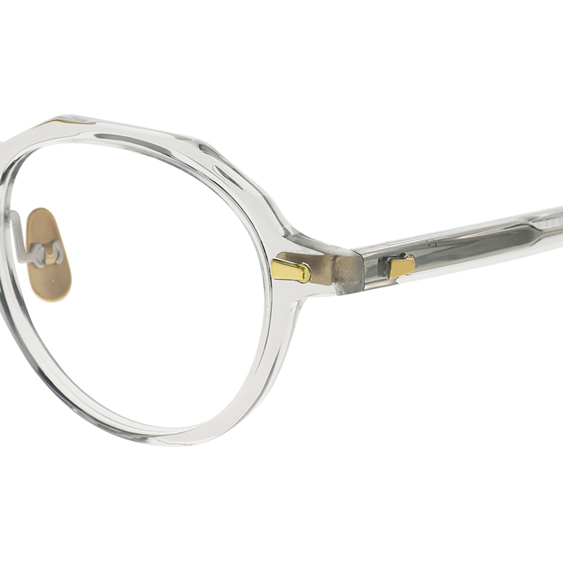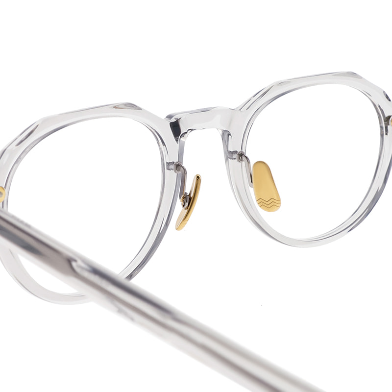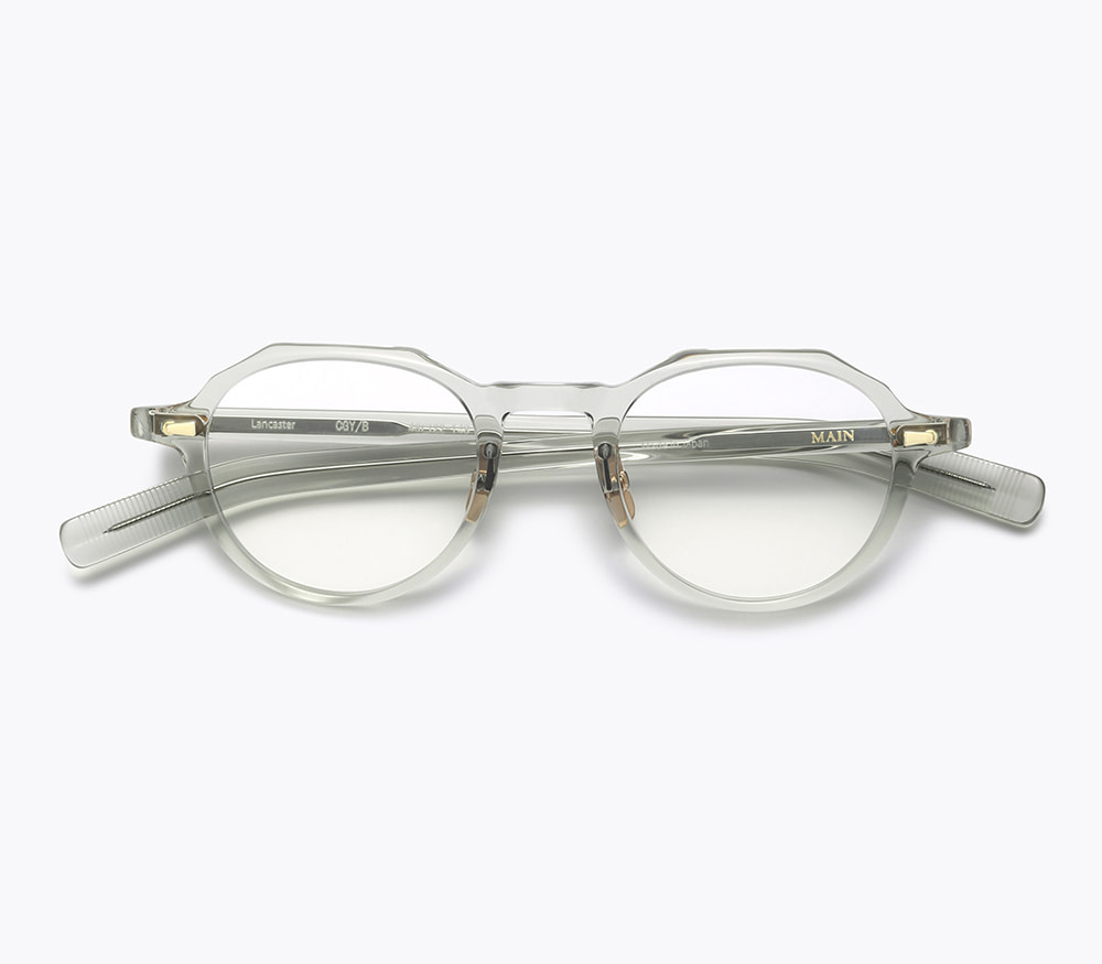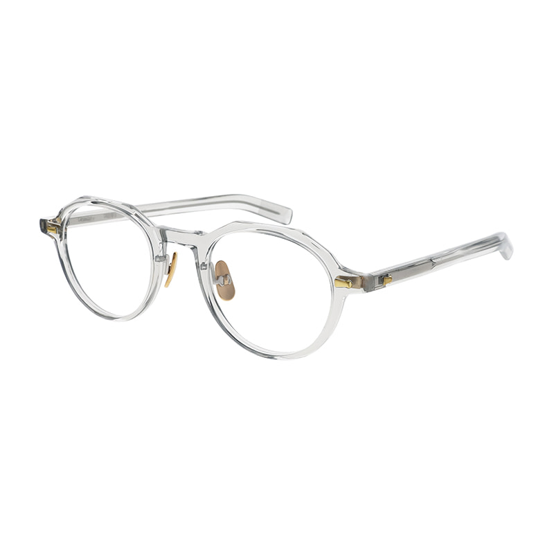 透明度の高いクリアグレーにゴールドの真鍮パーツを組み合わせたCrystal Gray。光の反射によって輝くテンプル芯と経年変化によってくすんでいくカシメ飾りがコントラストを生み、最もブランドの美意識を感じれる配色です。