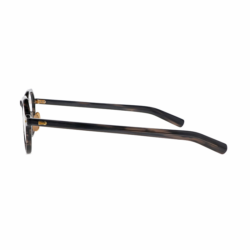フロント側からテンプル先に向かって断面が甲丸から角が立った造形に変化していくようにデザインされた特徴的なテンプルは、「放電」と呼ばれる金型を使った製造方法を用いて作られています。この製法は派手なデザインを作る際に用いられますが、金型を使いながらもあえてプリミティブな形状にすることでブランドの哲学でもある普遍的なディティールを表現。