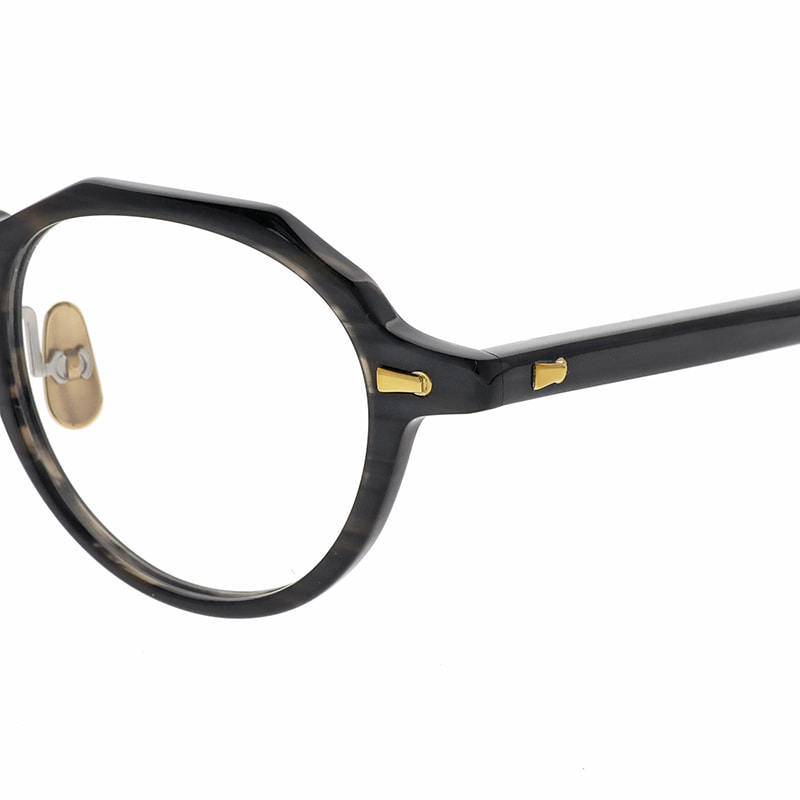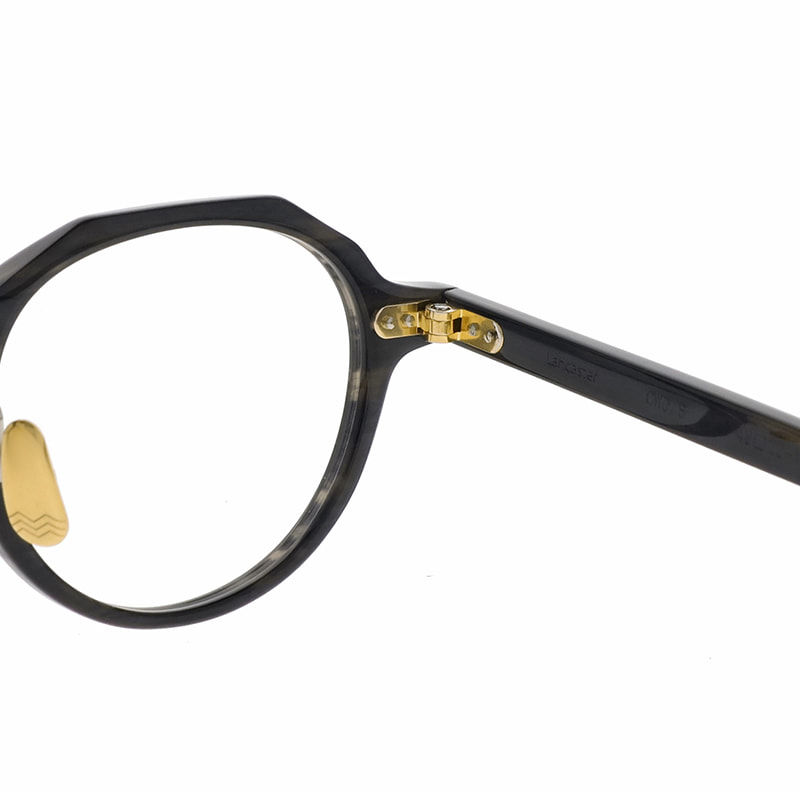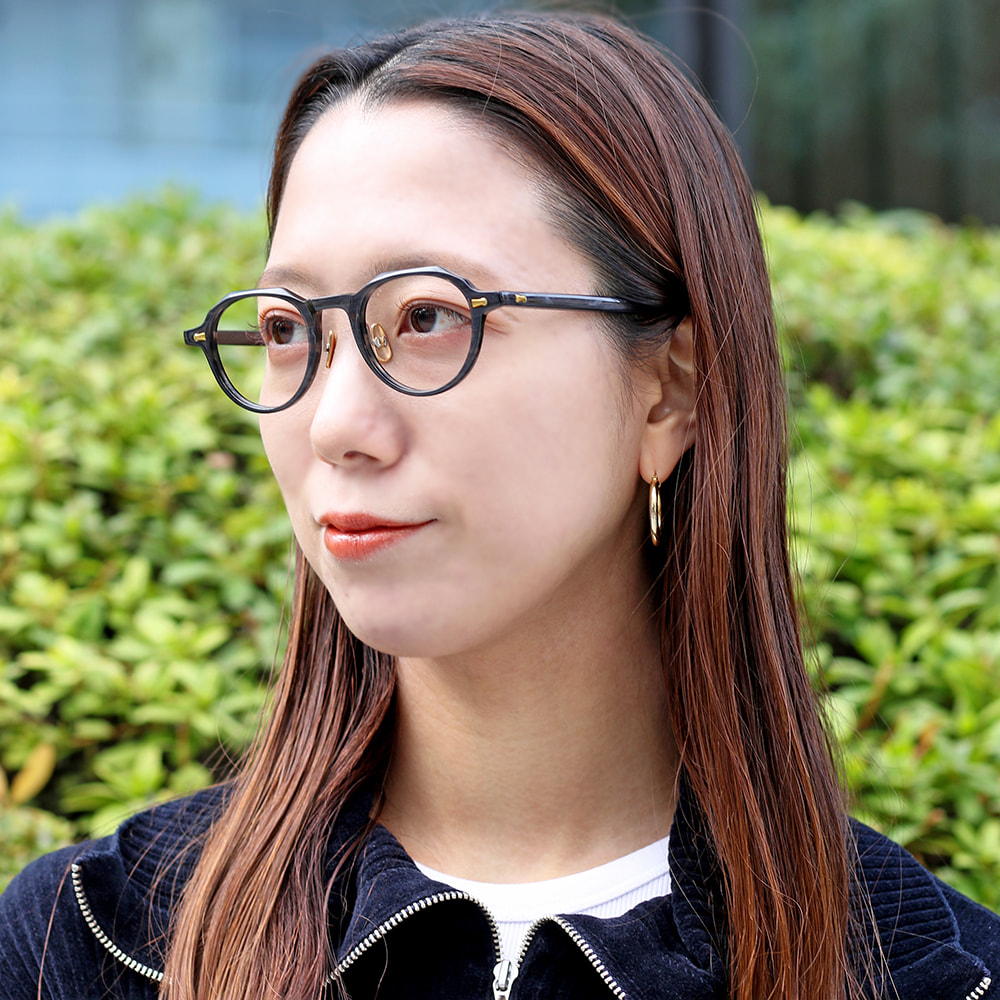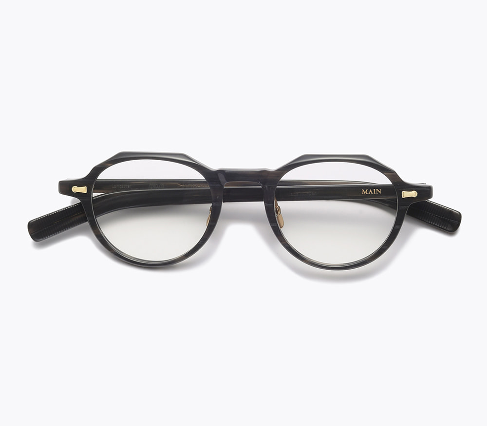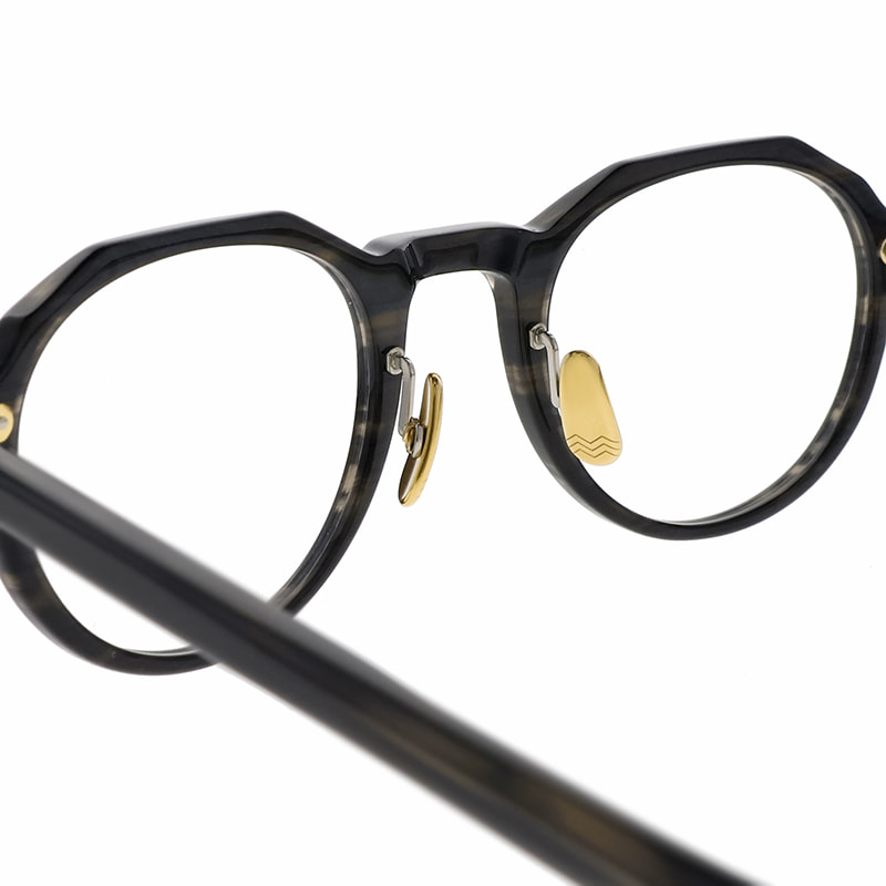 カシメ飾りに使用する金属パーツに合わせて、丁番、チタンノーズパッド、ブランドロゴまでを同じカラーに仕上げています。アセテート生地と金属のカラーリングによる多彩な組み合わせはMAINの魅力のひとつ。
