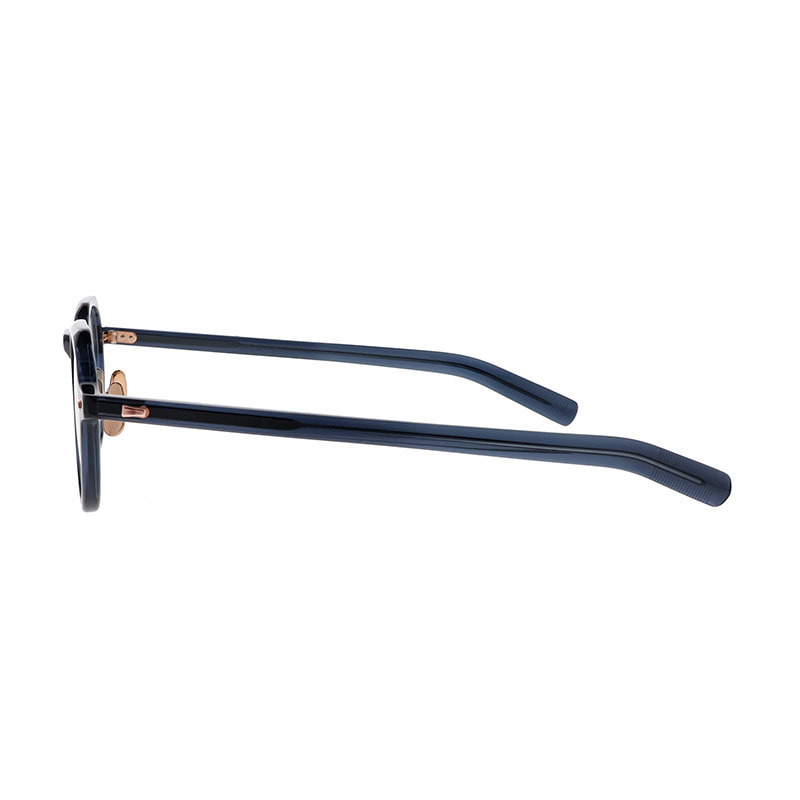 フロント側からテンプル先に向かって断面が甲丸から角が立った造形に変化していくようにデザインされた特徴的なテンプルは、「放電」と呼ばれる金型を使った製造方法を用いて作られています。この製法は派手なデザインを作る際に用いられますが、金型を使いながらもあえてプリミティブな形状にすることでブランドの哲学でもある普遍的なディティールを表現。