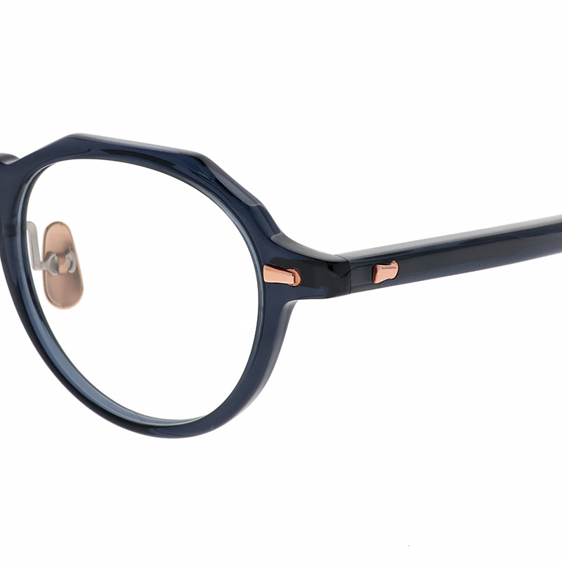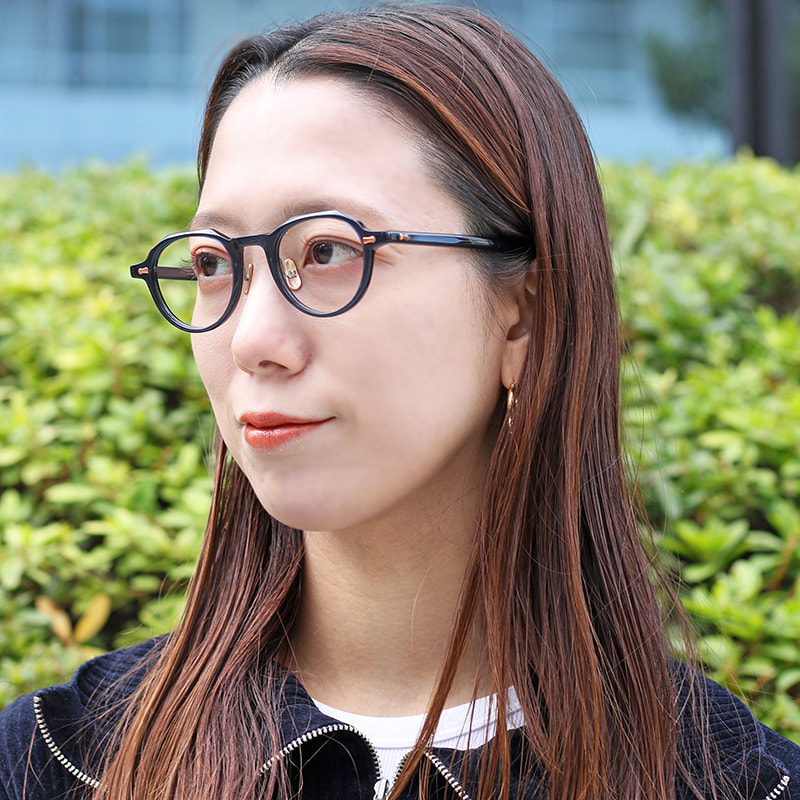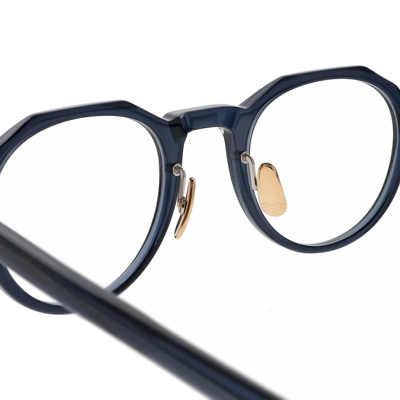 カシメ飾りに使用する金属パーツに合わせて、丁番、チタンノーズパッド、ブランドロゴまでを同じカラーに仕上げています。アセテート生地と金属のカラーリングによる多彩な組み合わせはMAINの魅力のひとつ。