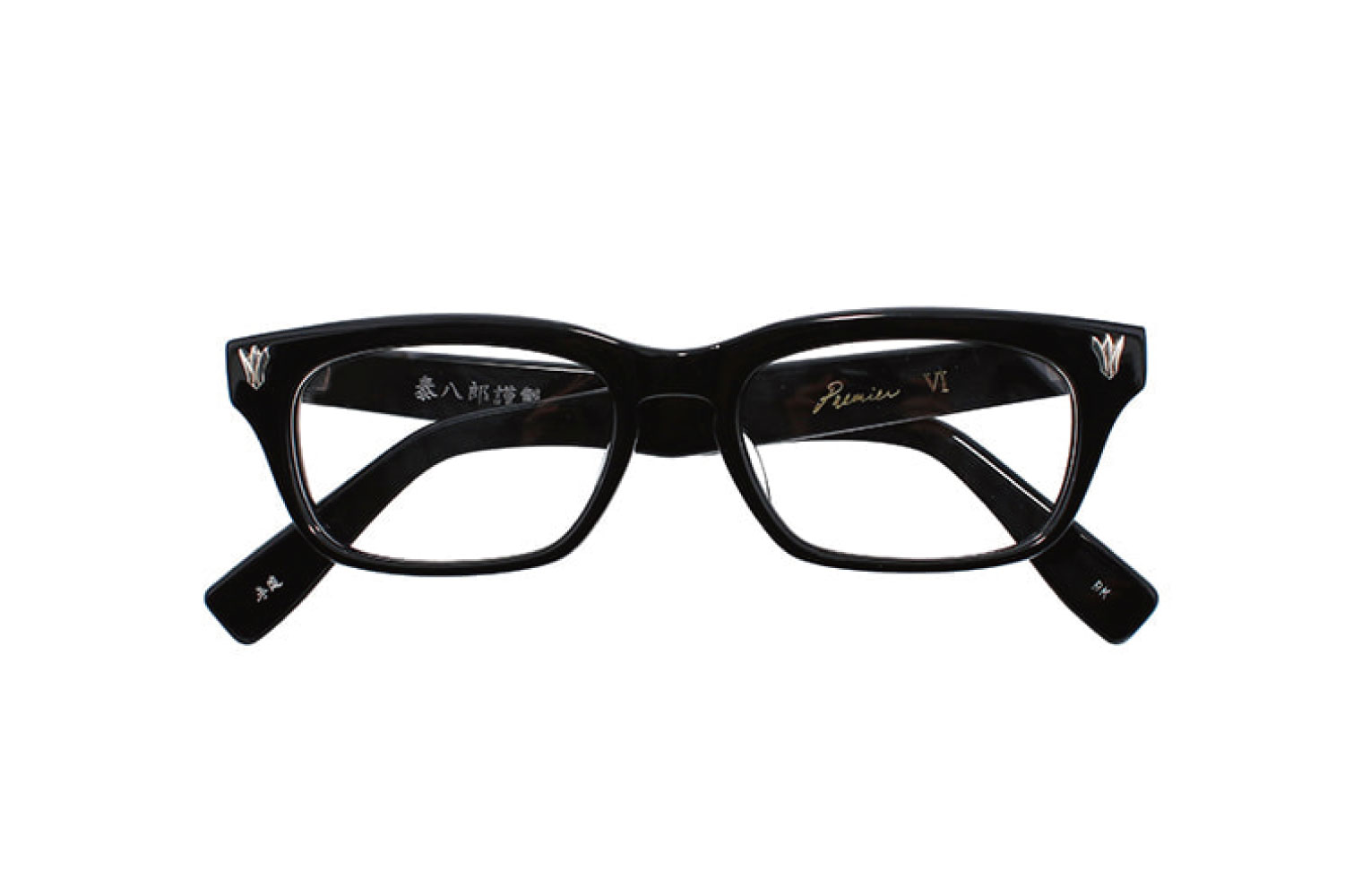 MODEL:Premier6COLOR:BKPRICE:63,800円金子眼鏡によるセルロイド製眼鏡ブランド「泰八郎謹製(たいはちろうきんせい)」。硬さと弾性を持つセルロイドの特徴を活かし、テンプルに金属芯を使用しない「ノー芯」製法を採用。鼈甲のような艶が出るまで磨かれた生地の美しさ、カシメ部分のsilver飾りとシンプルながら見どころが沢山のモデル。