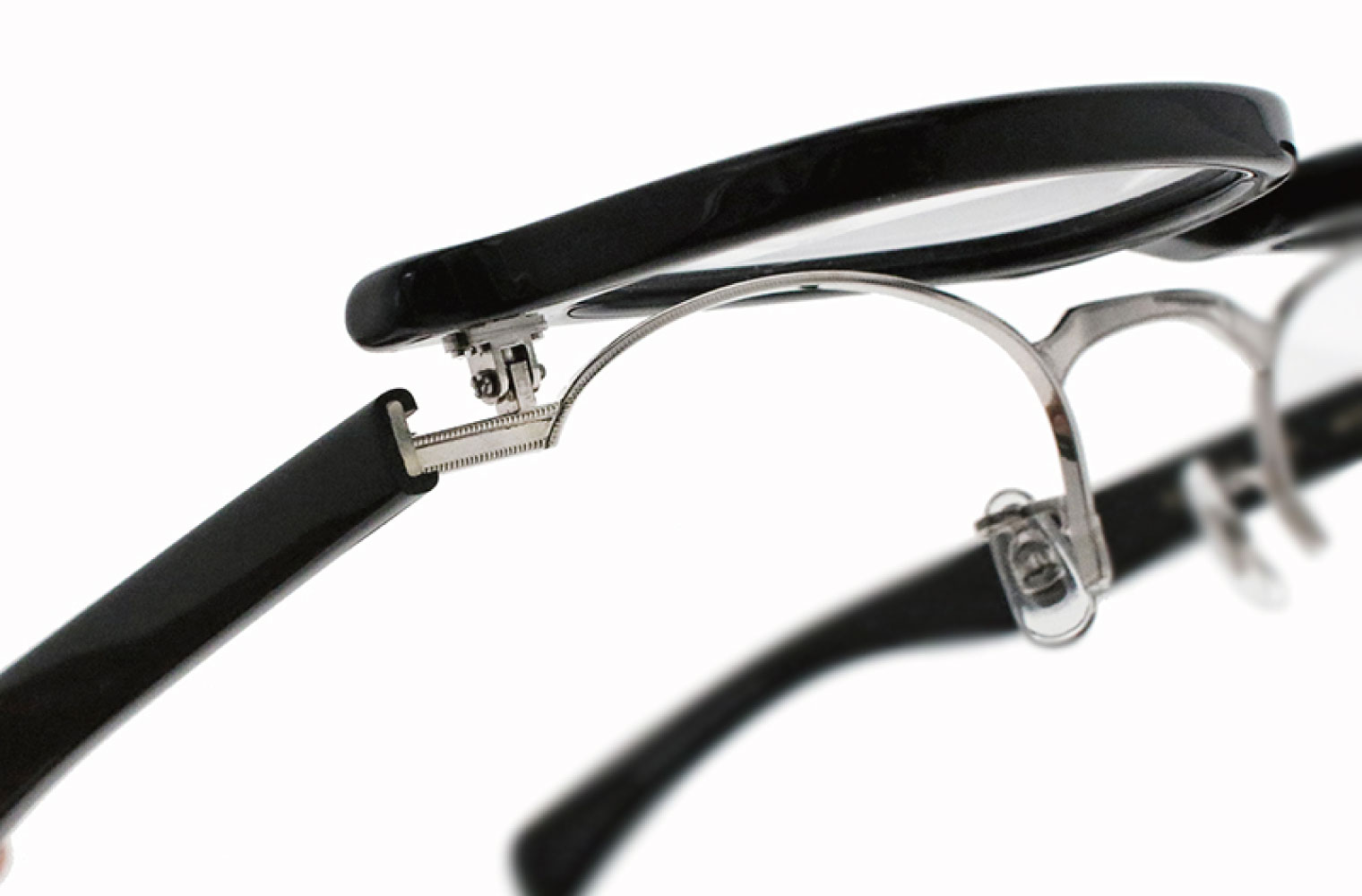 MODEL:Sadler-FPCOLOR:PBKPRICE:66,000円EYEVANの人気フレーム、Sadler(サドラー)をフリップアップ(跳ね上げ式)にしたSadler-FP。跳ね上げ部の丁番はバネ内蔵のオリジナル丁番を使い、ベースとなるフレームのチタン製メタルパーツはすべてオリジナルで製作。手元を見る時に眼鏡を外したほうが見やすいという方に、スマートな所作で手元を見ることができおすすめです。